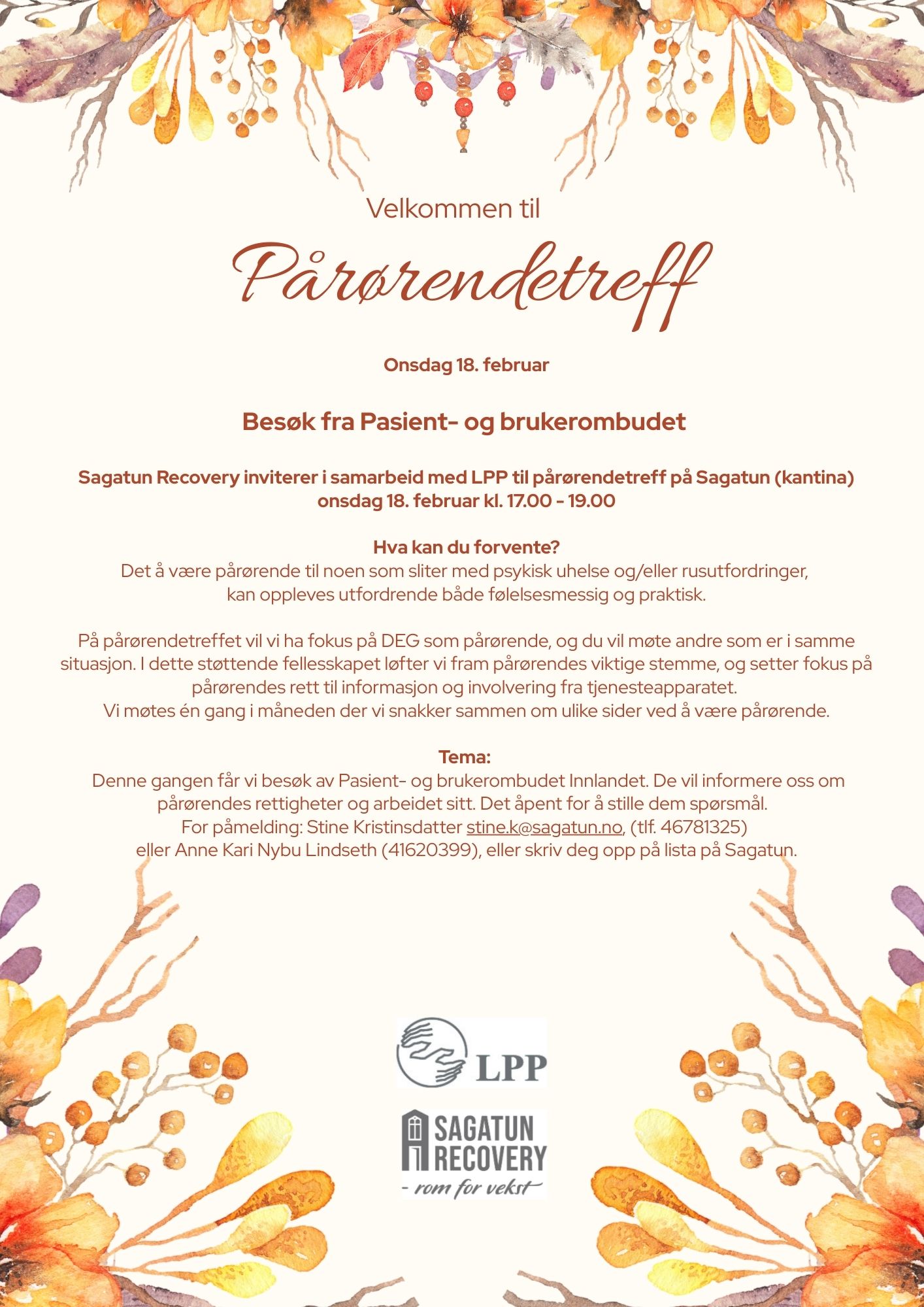 Sagatun Recovery inviterer i samarbeid med LPP til pårørendetreff på Sagatun (kantina) onsdag 18.02.26 kl. 17 – 19.