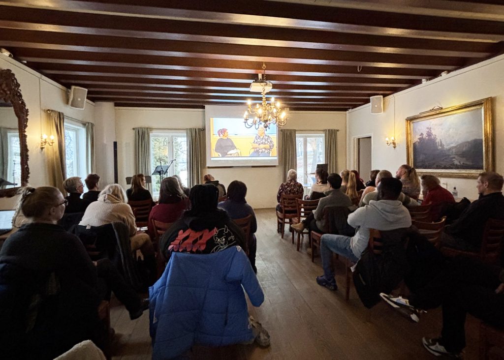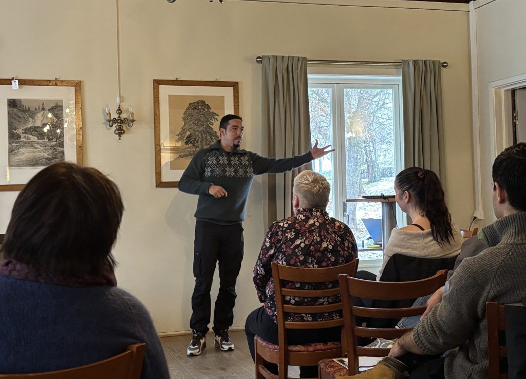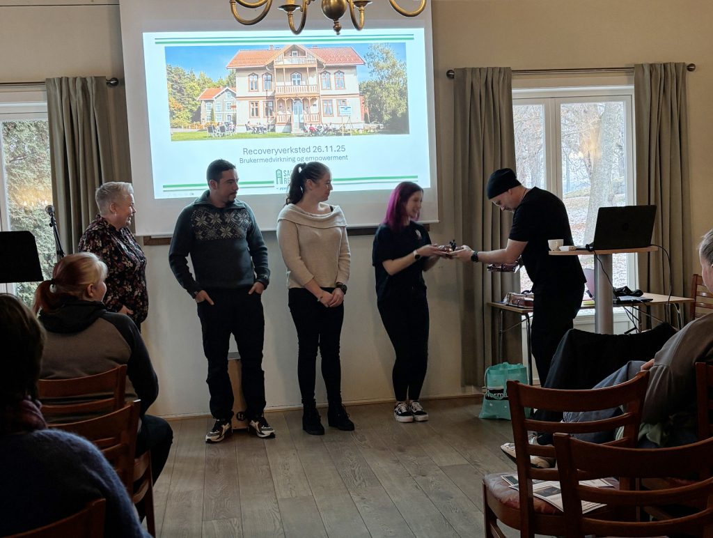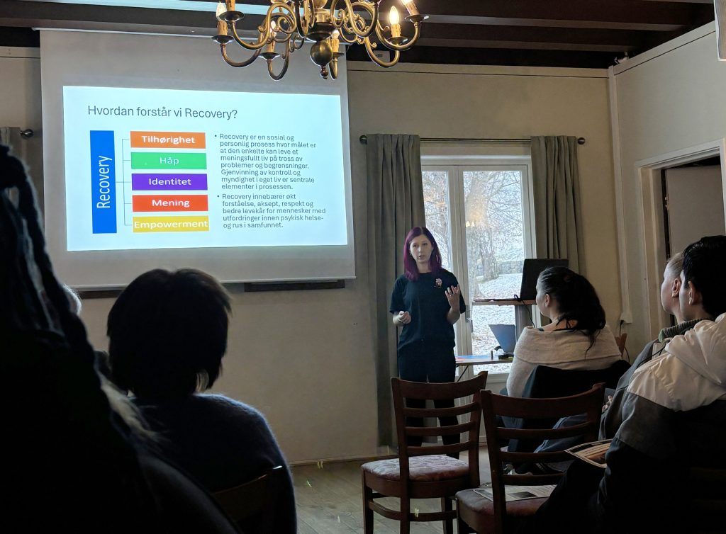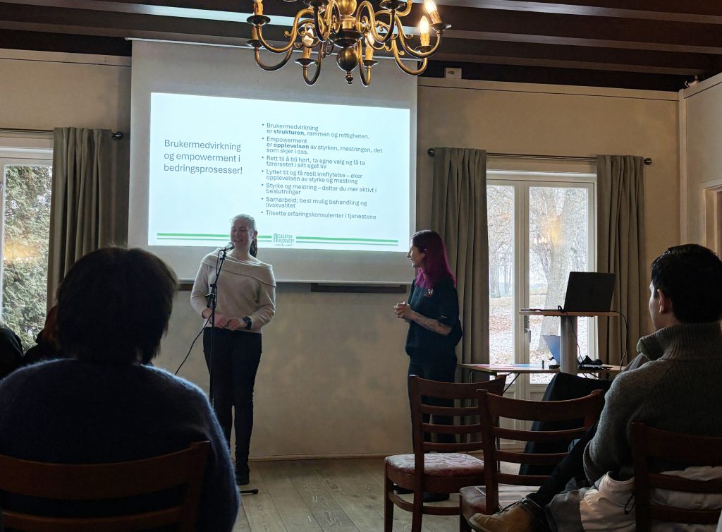 Stine, som ledet verkstedet, åpnet dagen med temaet brukermedvirkning og empowerment, der hun forteller at Sagatun har vært viktig i hennes bedringsprosess, at hun startet som bruker av senteret, og at hun nå jobber 50 % som kursleder der. Sagatun har tre avdelinger som arbeider med aktivitet og mestring, brukerstyring og selvstyrking, og med å løfte brukere og pårørendes stemmer, også inn i forskning.