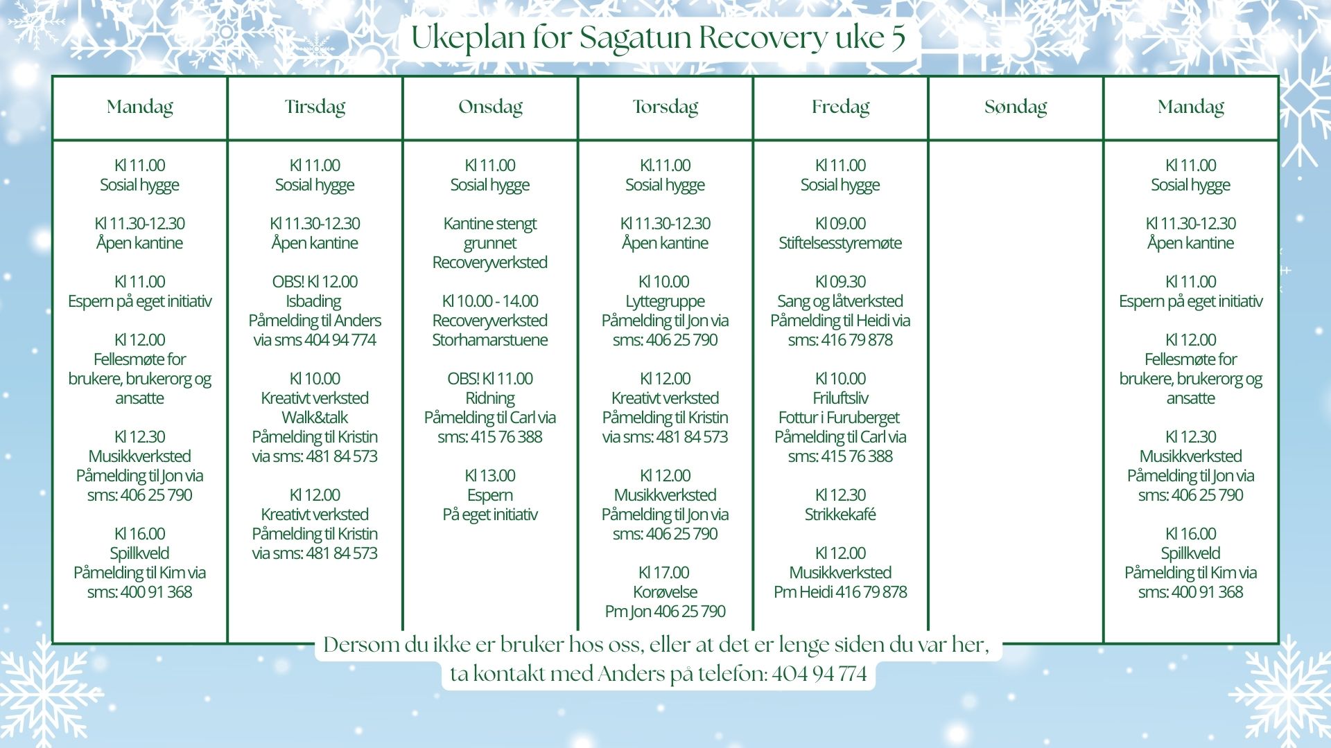 Med vennlig hilsen Brukerstyret, e-post: brukerstyret@sagatun.no eller telefon: 458 34 345. Følg med på ukeplanen og hjemmesiden vår.