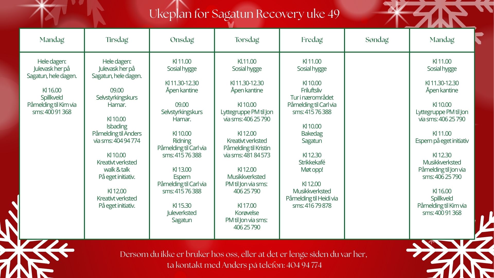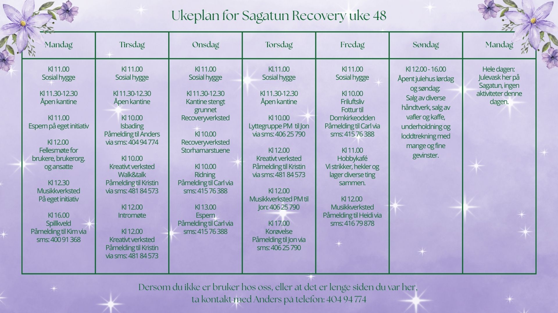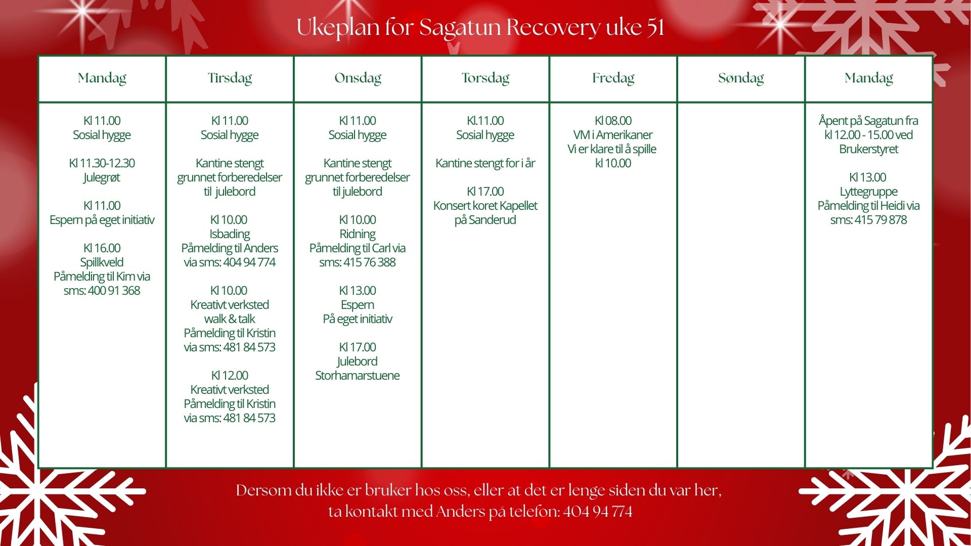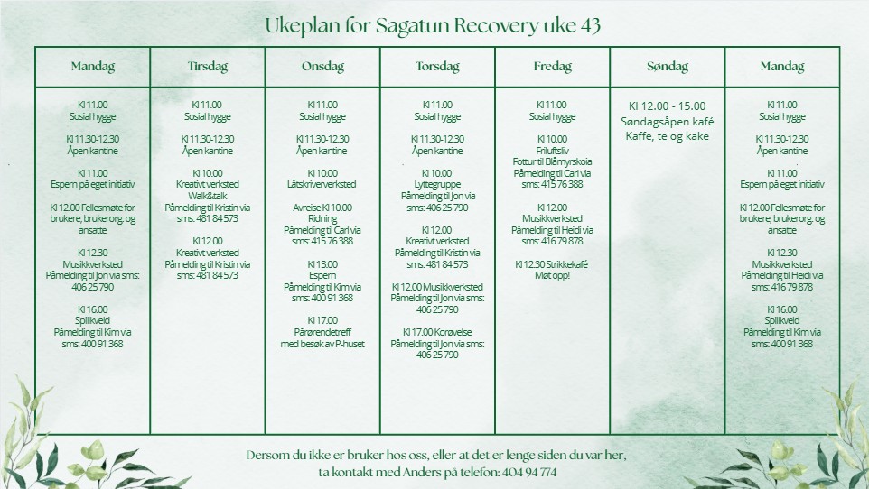 Med vennlig hilsen Brukerstyret, e-post: brukerstyret@sagatun.no eller telefon: 458 34 345. Følg med på ukeplanen og hjemmesiden vår.