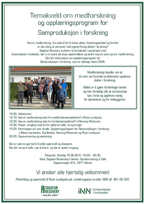 Sagatun er medarrangør av utdanning for medforskere gjennom kurset «Samarbeidsbasert forskning» sammen med Høgskolen i Innlandet (INN). Dette kurset er for både de som skal lede forskningsprosjekter og for personer med egenerfaring som ønsker å bruke sine erfaringer inn i forskningsarbeid. Ta kontakt med oss dersom det er aktuelt for deg å bli medforsker, eller du er en forsker som ønsker å ha med medforskere i ditt forskningsprosjekt.